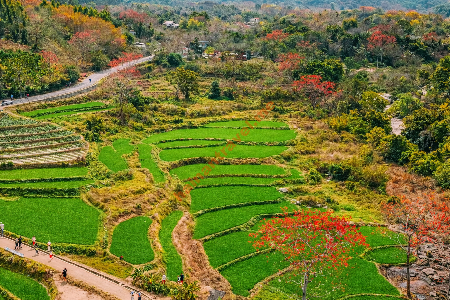 — наблюдение за красочными цветами капок на фоне зелёных склонов и террас;