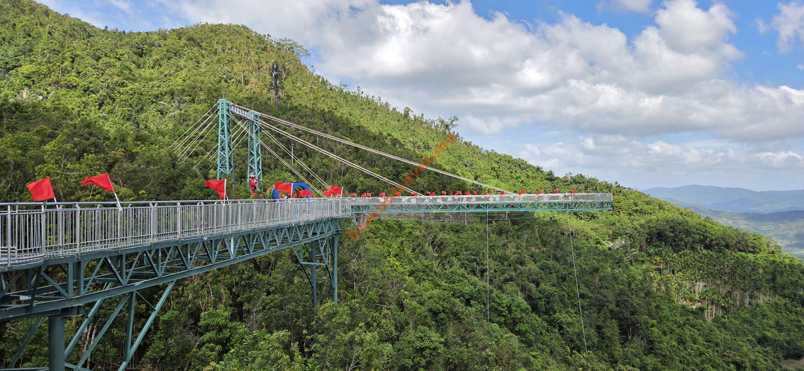 Подвесной мост и смотровая площадка находятся в самом конце маршрута — пропустить невозможно, основная тропа проходит прямо через мост. После него — подъём на смотровую площадку высотой с десятиэтажный дом, около 7 минут пешком. Открывается панорама на хайнаньские горы. Подниматься стоит, даже если силы уже на исходе.