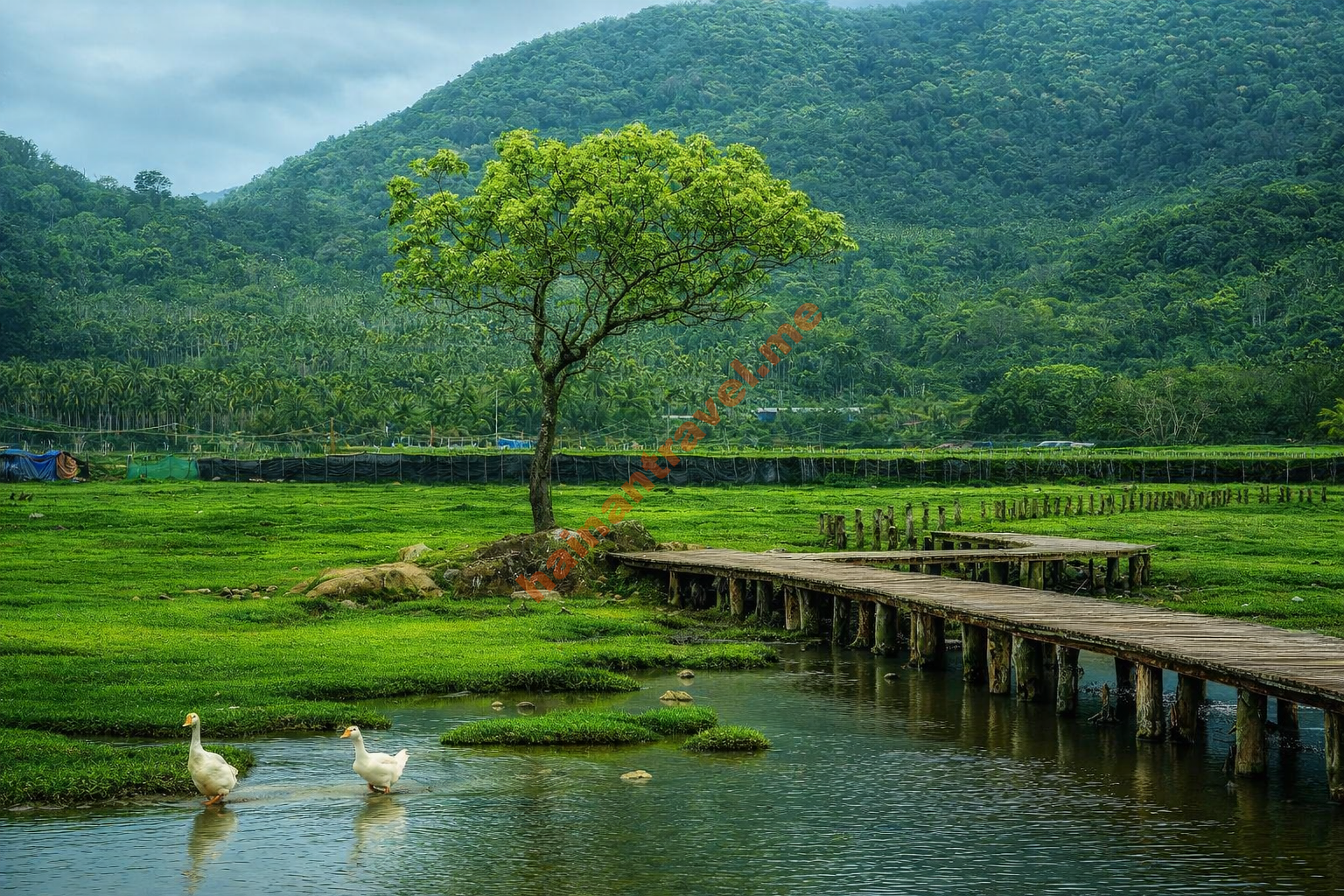 Посещение Qiaohai Ranch — это прежде всего знакомство с первозданной природой Хайнаня. На территории открываются обширные луга с сочной травой, которые летом и в межсезонье покрыты зеленью. Здесь можно спокойно прогуливаться и любоваться пастбищами, чистыми водоёмами и панорамой гор на горизонте. Природа ранчо напоминает европейские пастбища, что делает локацию привлекательной для фотосъёмки.