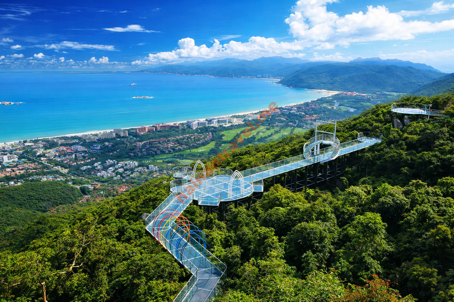 Одна из главных точек — панорамный стеклянный мост на вершине парка: он расположен примерно на высоте 450 м, имеет общую длину 400 м и даёт вид на бухту Ялунвань, где впереди море, а позади — зелёные горы.